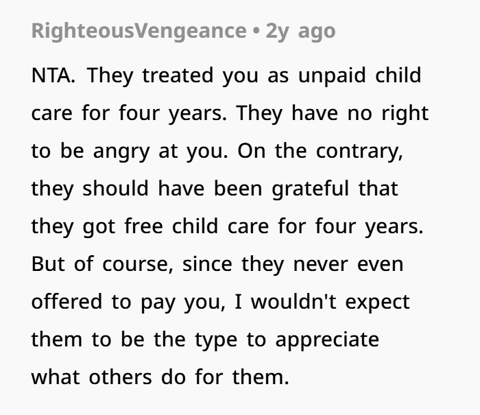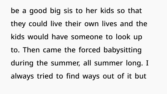 It’s worth noting that your stance could be framed not as “never ever” but as “I will no longer be your full‑time summer babysitter; we can negotiate occasionally if I choose and if I’m paid/compensated/respected.” But given your story, you may feel that’s too generous right now and you need complete separation. That also is valid.