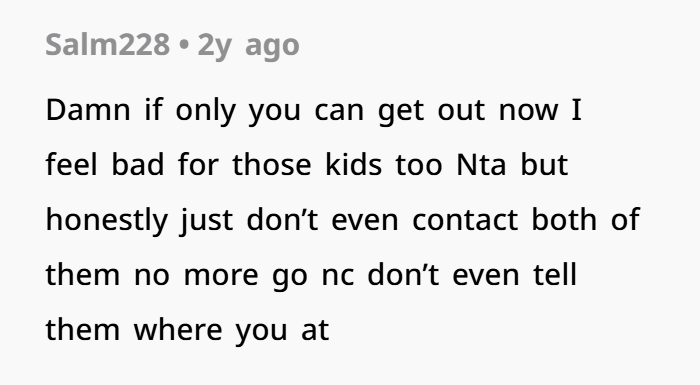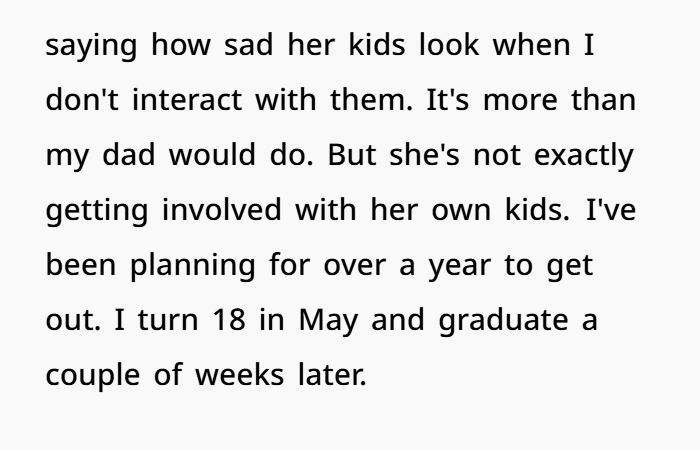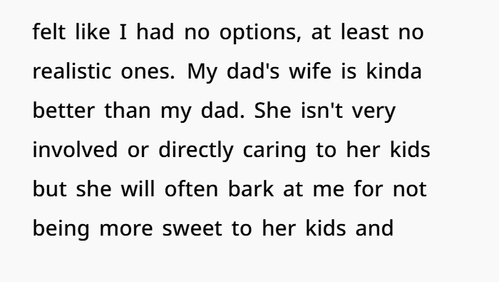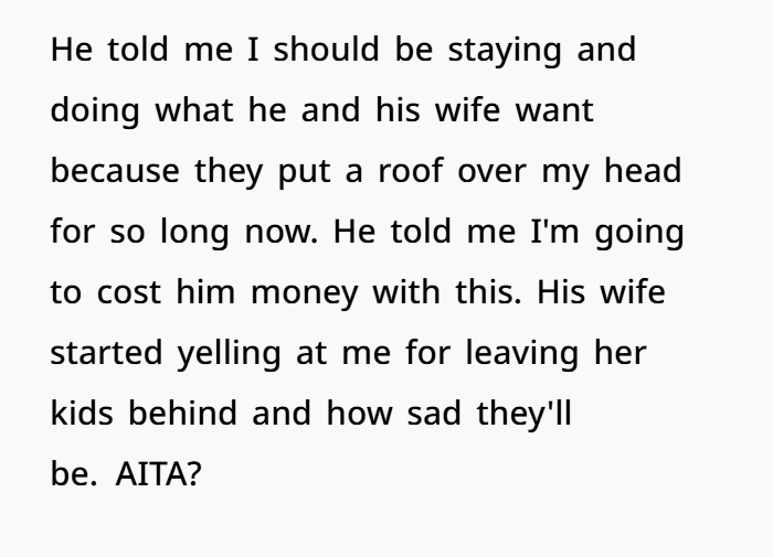 Your dad accused you of being selfish, pointed out that you’ve been the most consistent figure in the kids’ lives, and said that because they “put a roof over your head for so long,” you owe it. His wife also confronted you, saying you’re abandoning the kids and leaving them sad. You’re asking: AITA (Am I the asshole) for standing your ground?