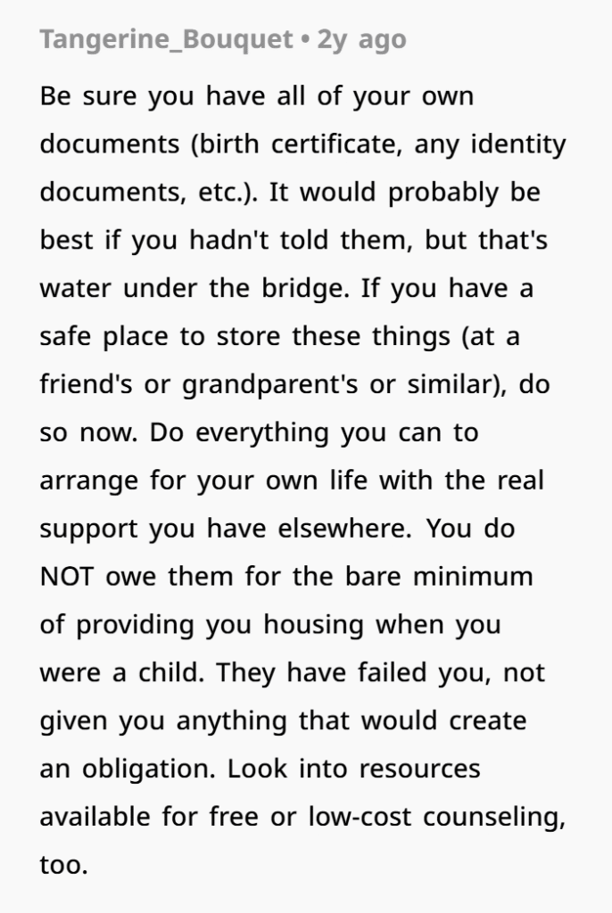 • Them saying you’ll “cost money” or that you owe it to them because you lived under their roof gives you obligation in return for a massive sacrifice on your part. That is more like emotional leverage than fair expectation.