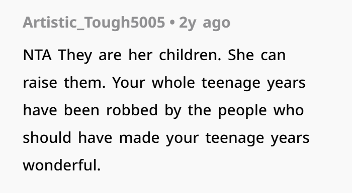 Many online commenters told the teen it wasn’t her responsibility to care for the kids and that she’d done enough, encouraging her to leave the house
