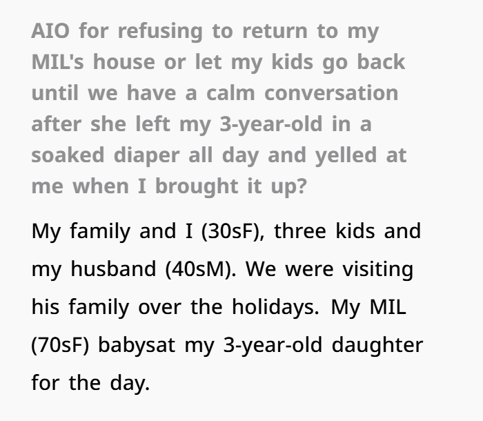 I get it — when family drama hits, especially with in‑laws, emotions can go everywhere fast. You and your family were visiting your husband’s mom over the holidays. During that visit, your MIL babysat your 3‑year‑old — and when you picked her up, her diaper was still soaking wet after hours. All through the day. Like urine soaked through two layers of clothes.