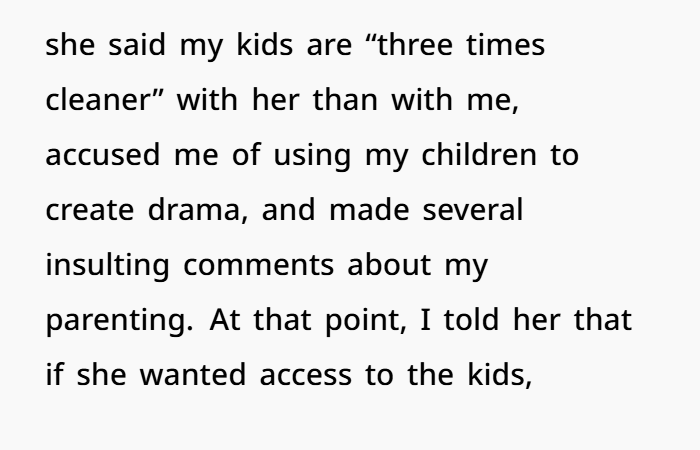 Your boundary isn’t “You can never see the kids again.” It’s, “I want respect, clarity, and an apology that acknowledges the issue and the way I was spoken to.”