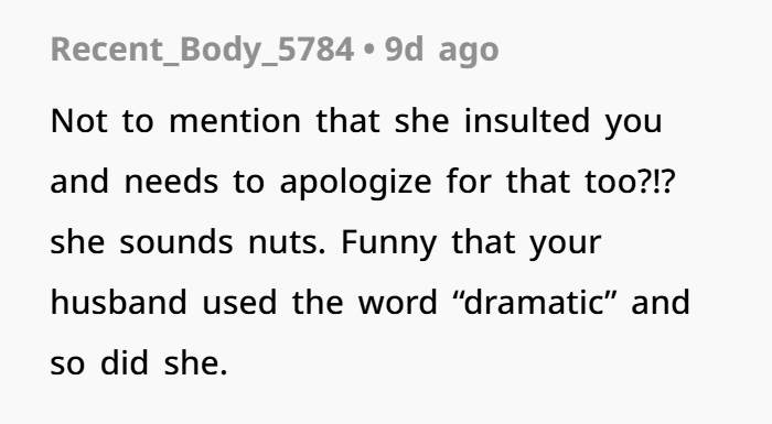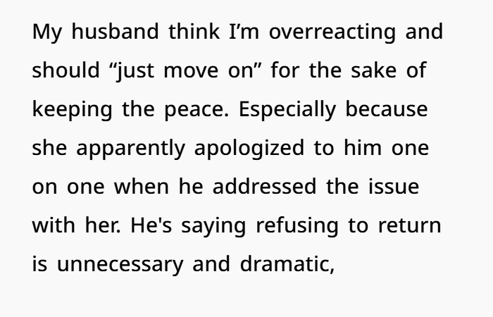 You mentioned your husband said she apologized privately to him. This is a common dynamic in families — especially where in‑laws feel more comfortable addressing the son rather than the daughter.