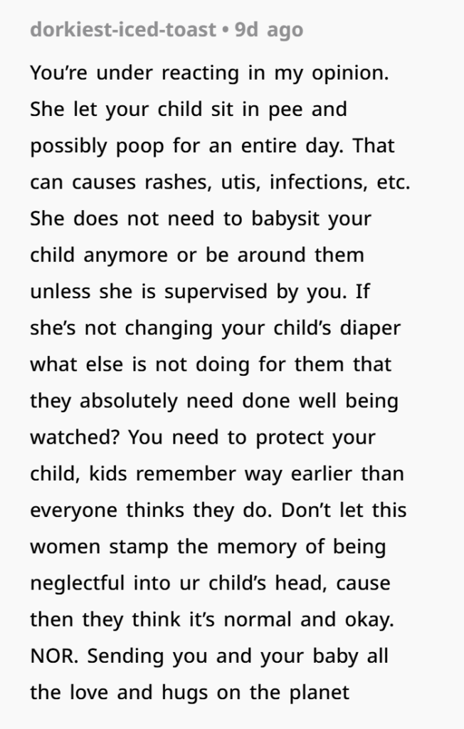 Anyone caring for a toddler is expected to handle basic needs like diaper changes. If you were dealing with a pet that was wet for hours — you’d be upset. With a child? It’s even more serious. You weren’t dramatic for noticing something was off. You were observant. And concerned.