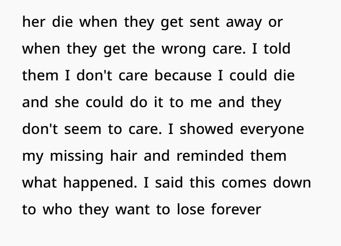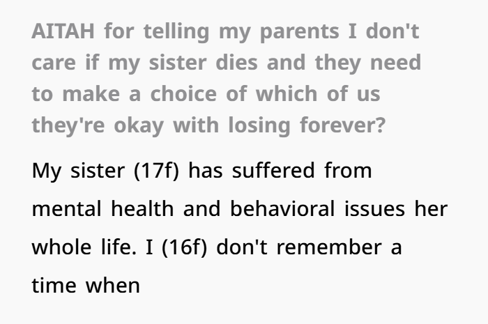 After years of trauma, including a terrifying incident where her sister pulled out a large chunk of her hair—causing long-term damage—OP finally snapped. She told her parents that if they refuse to protect her by seeking real help for her sister, they might lose her forever. She even said, in raw honesty, that she doesn’t care if her sister dies because she’s never felt safe or loved in her presence. That comment shattered the household—and now her parents are calling her heartless.