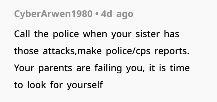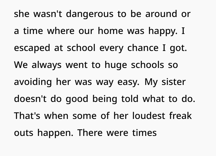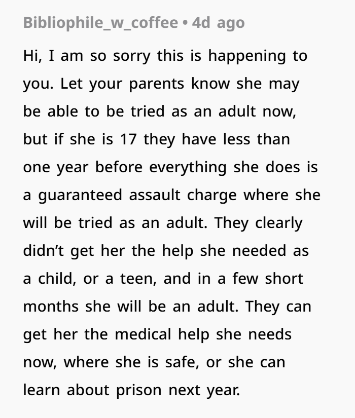 Kids like OP get told to be understanding. To be patient. To “remember it’s not her fault.” But no one’s asking the violent sibling to stop. No one’s protecting the victim.