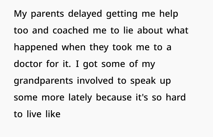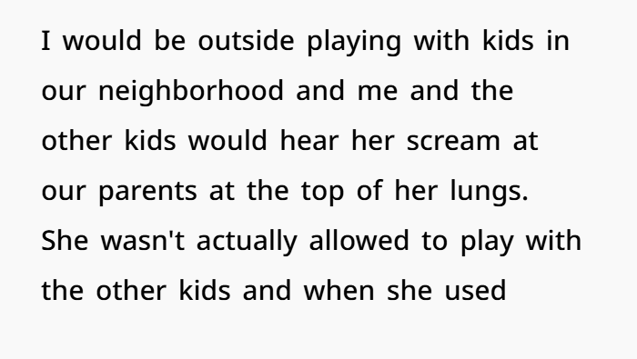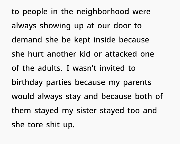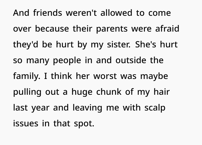 OP’s been isolated. She couldn’t bring friends home. She got left out of birthdays. She was told to lie to doctors about injuries her sister caused. That’s not sibling rivalry—that’s emotional and physical abuse being ignored by adults who should know better.