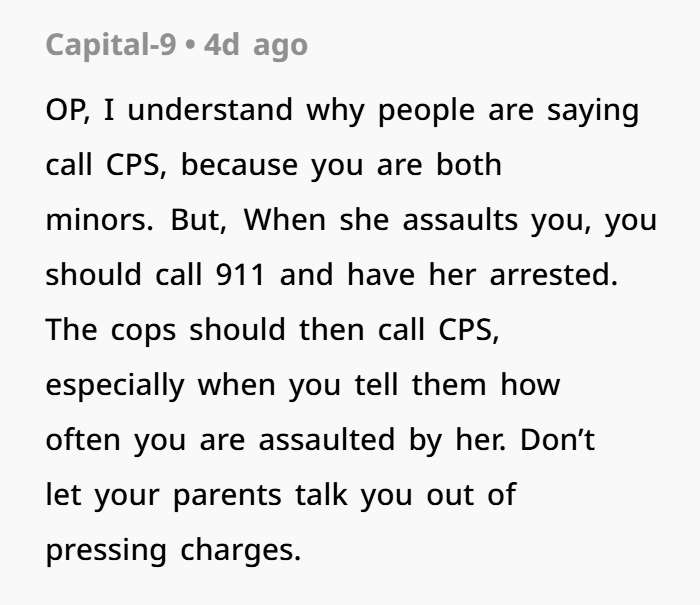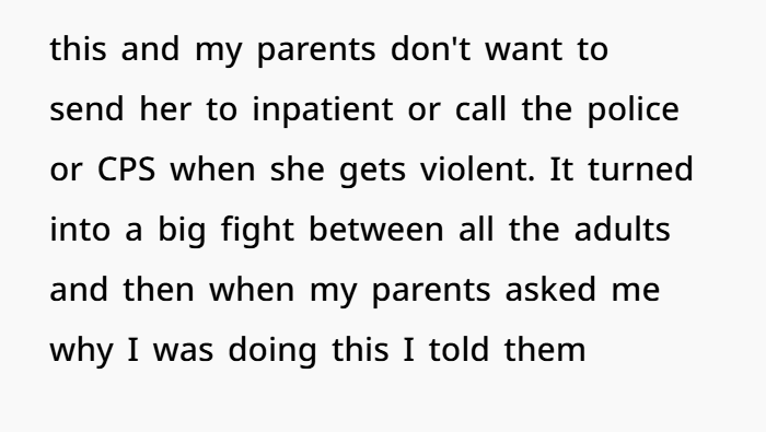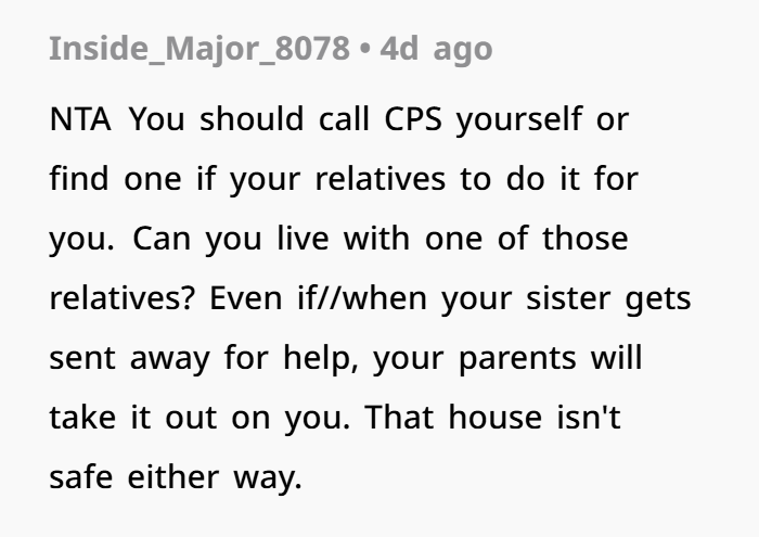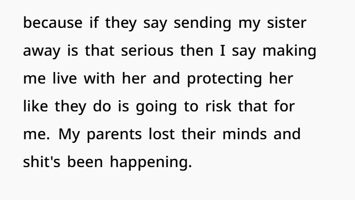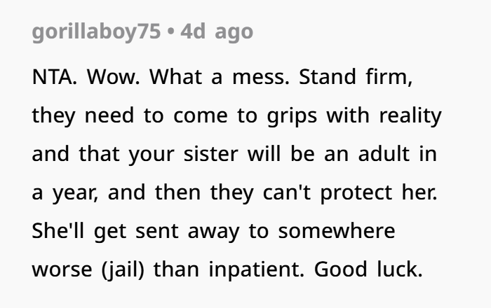 OP isn’t a villain. She’s a teenage girl who’s spent her whole life in fear. She’s seen her sister hurt others, hurt her, and watched her parents do nothing.