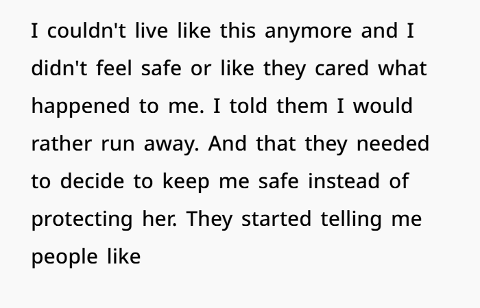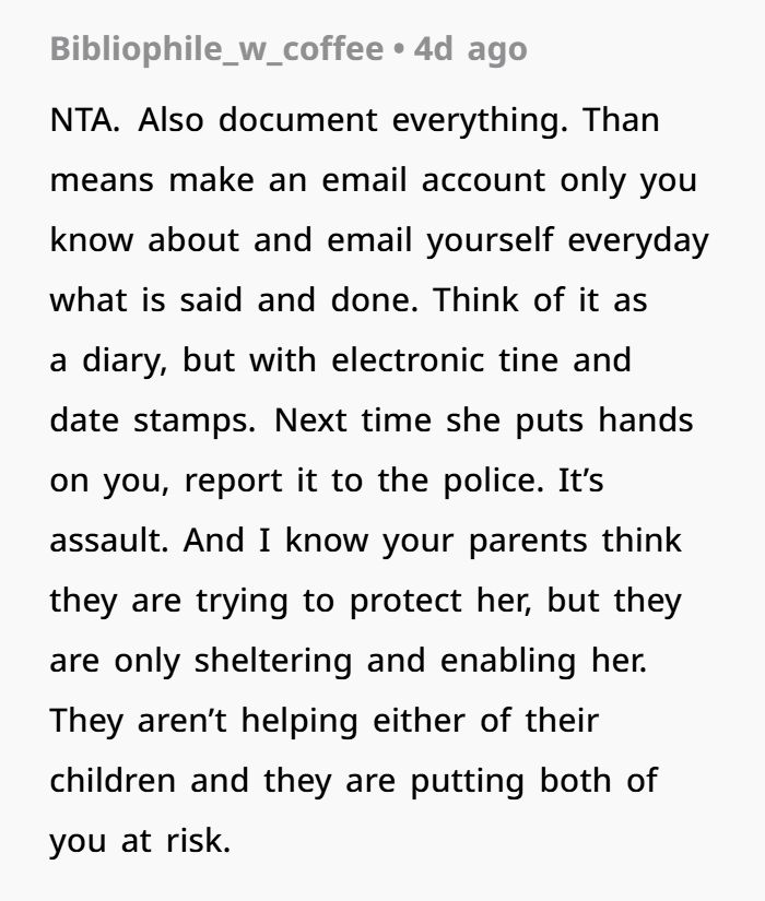 OP’s parents are doing that in real time. They’re telling her she’s “heartless” instead of admitting that her sister hurt her. They’re more afraid of sending one daughter away than losing the other entirely.