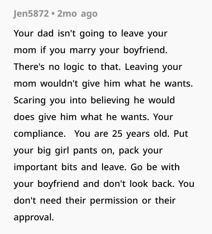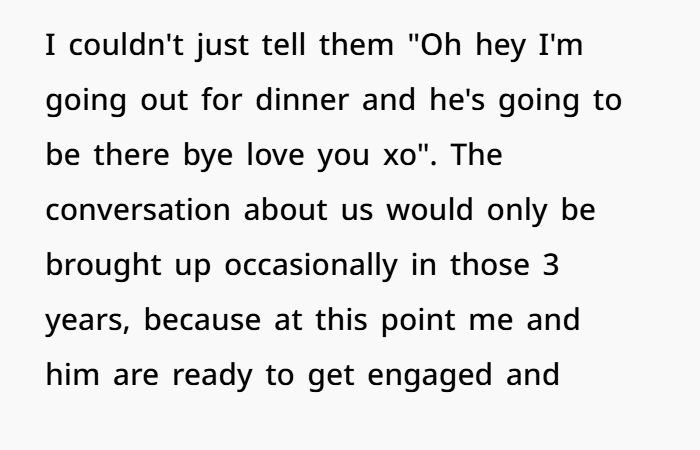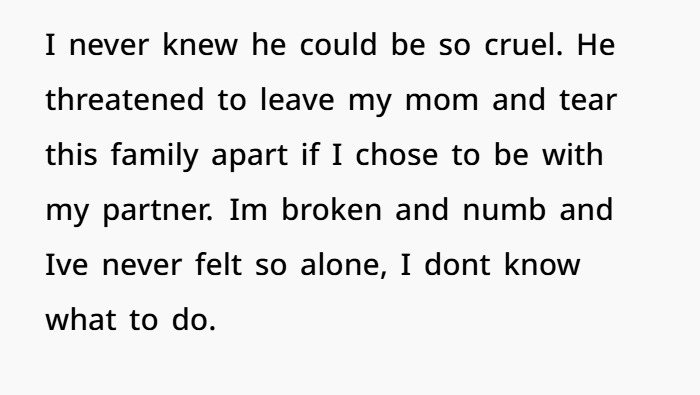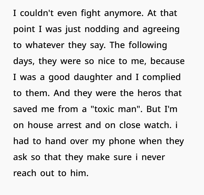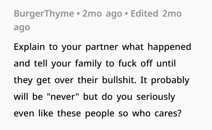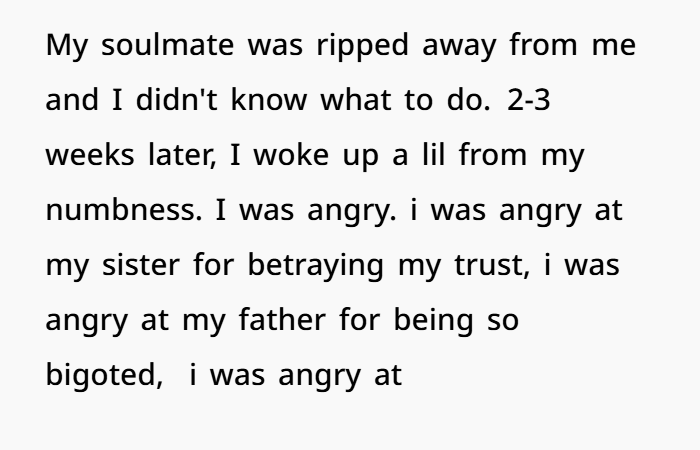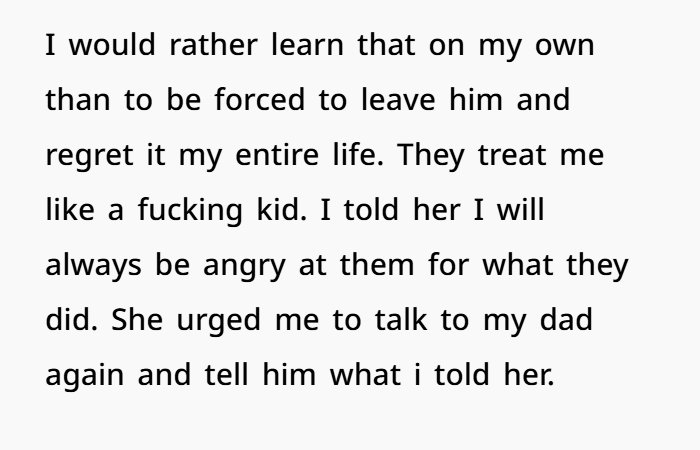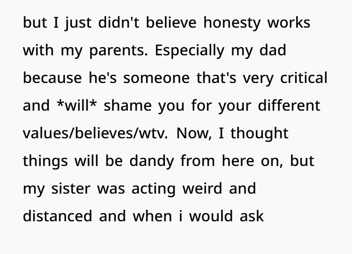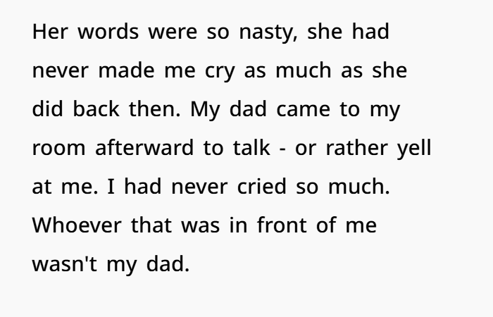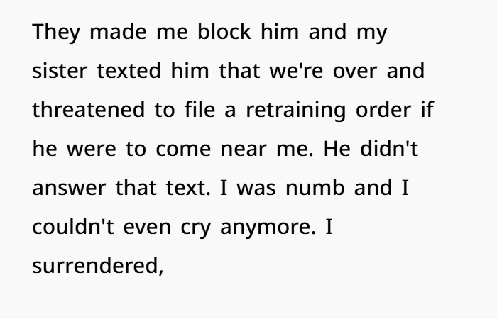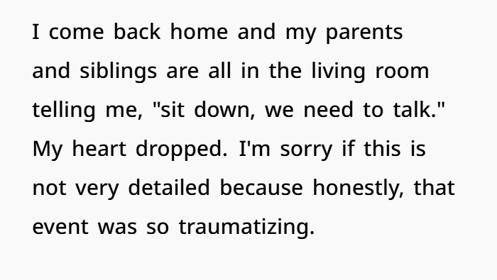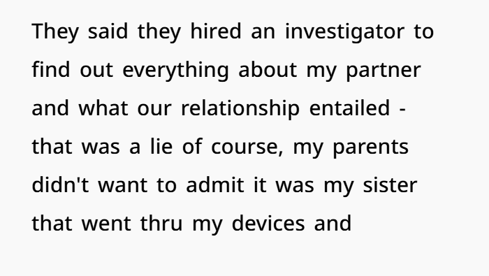 Instead, her sister—the “third parent” of the family—secretly went through her private messages, coordinated with their parents, and confronted her in a humiliating six-against-one ambush. They accused her partner of manipulation, banned her from seeing him, and even threatened restraining orders. Broken and numb, she complied—at least at first. But now, months later, she’s angry, heartbroken, and questioning whether she’ll ever forgive her family.