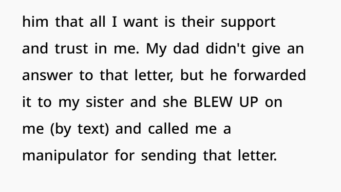 What her sister and parents did—rifling through private communications, staging an ambush, threatening legal action—is not just “family drama.” It’s coercive, invasive, and deeply damaging.