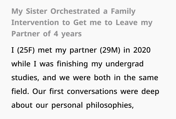 Imagine thinking your older sister is finally coming around to support your relationship—only to discover she’s been secretly orchestrating a family-wide “intervention” behind your back. That’s exactly what happened to this 25-year-old woman who wrote in about how her family tore apart her relationship of four years.