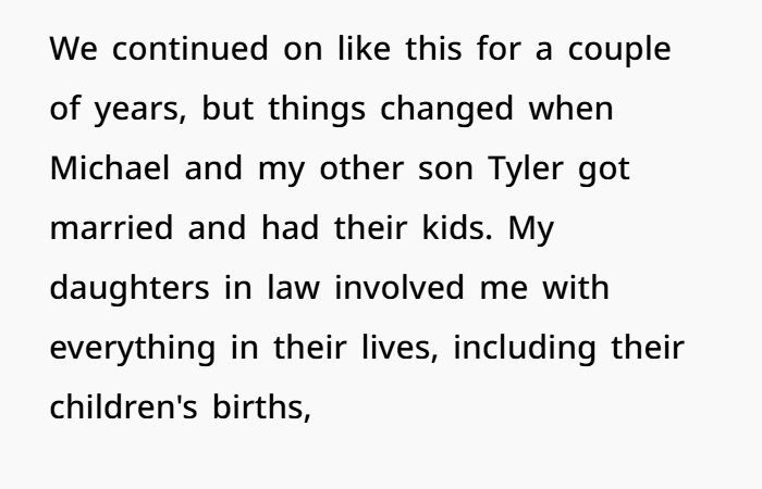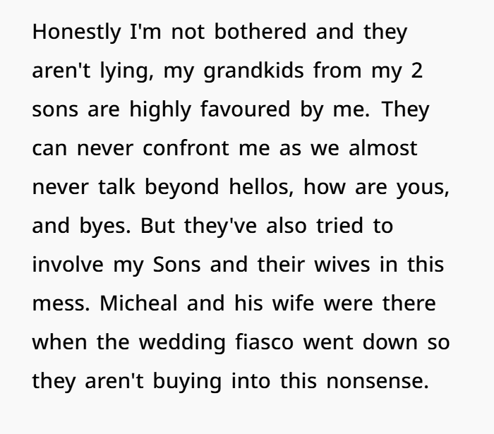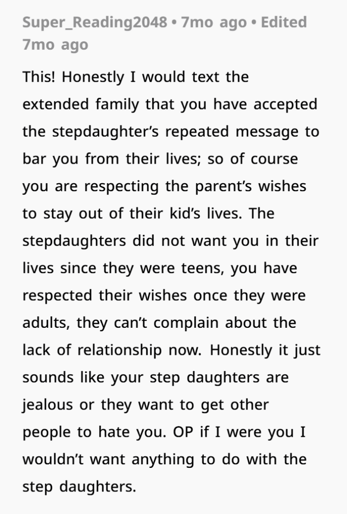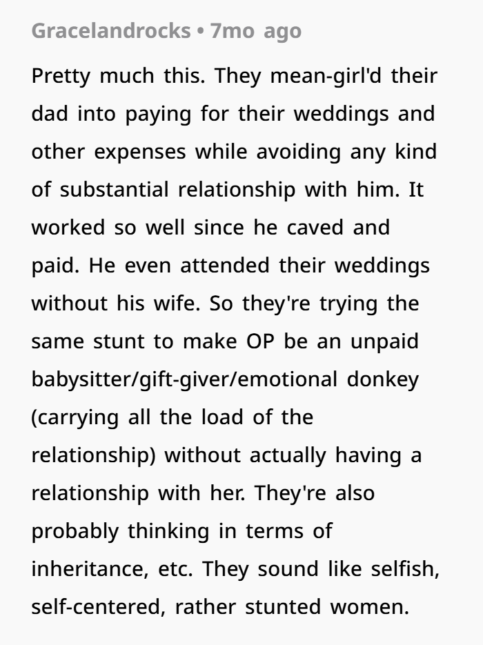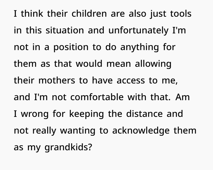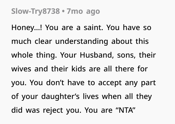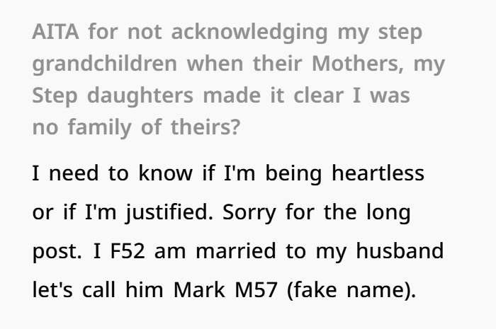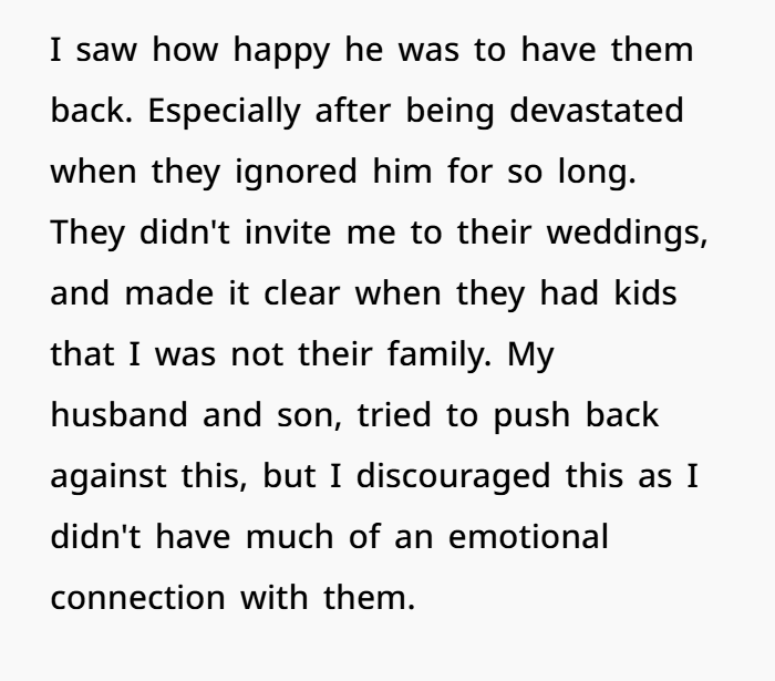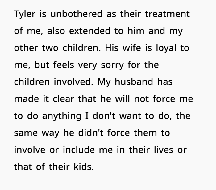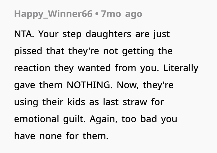 Now, those same daughters are upset that the OP doesn’t treat their kids—the step-grandchildren—the same as her biological grandchildren. They’ve gone as far as to launch a guilt campaign through extended family. But the OP stands firm. She’s polite to the kids, includes them in group activities, and gives them gifts, but she doesn’t feel any emotional bond or desire to play the doting grandma role to children whose mothers clearly wanted nothing to do with her.