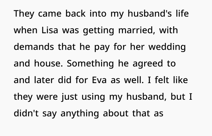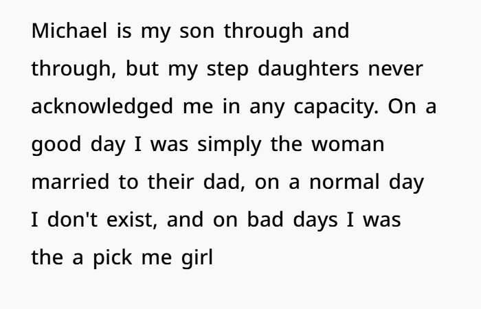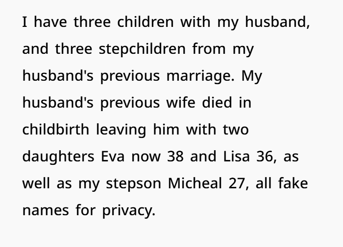 This story is soaked in emotional complexity and decades of hurt. At its core is a 52-year-old woman, married to her husband of many years, with three biological children and three stepchildren from her husband’s first marriage. The stepdaughters—Eva (38) and Lisa (36)—never accepted her. Despite her efforts over the years, she was never acknowledged as any sort of parental figure. On good days, she was invisible. On bad days, she was openly mocked as a “pick-me girl.” The stepdaughters even cut contact for years, only reconnecting when they wanted financial support for weddings and homes—something their father (the OP’s husband) provided.