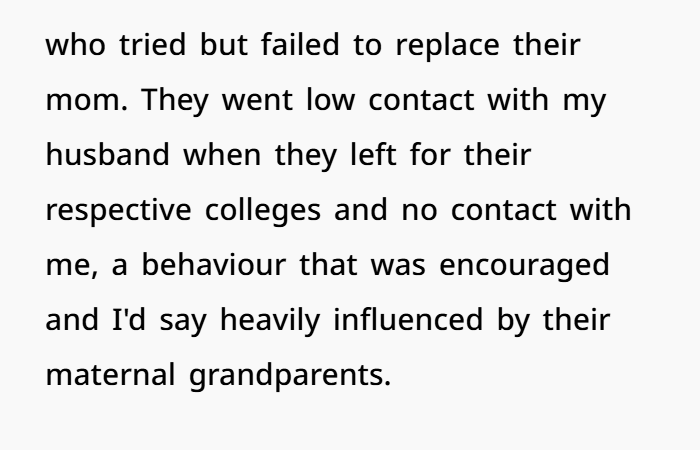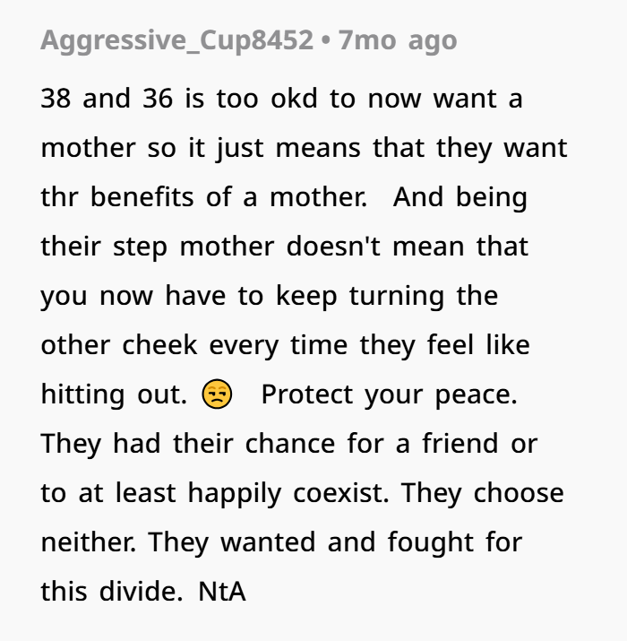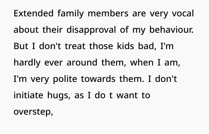 Here’s where it gets sticky. The kids. They didn’t reject anyone. They didn’t exclude her. They’re just… there. And while the OP has made it clear she isn’t cruel or dismissive to them—she still doesn’t pursue closeness.