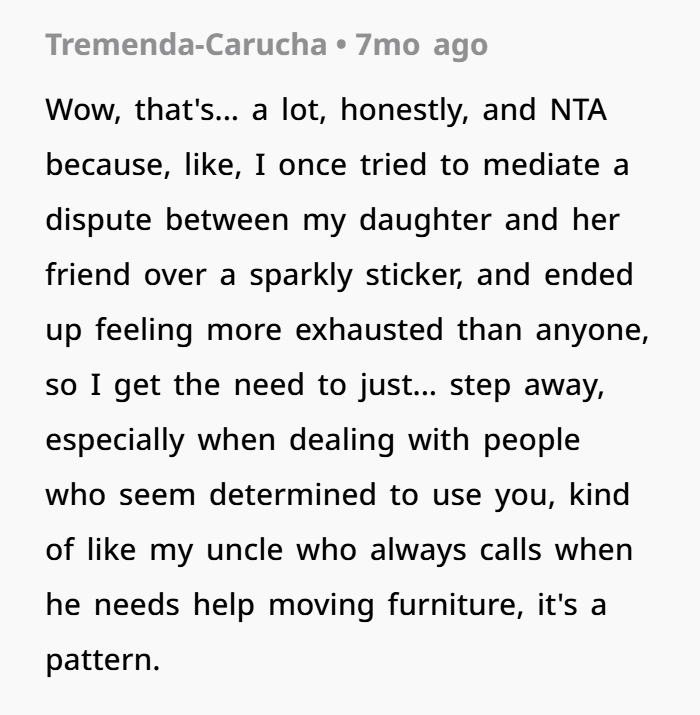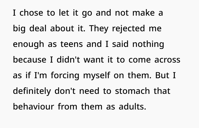 The word “boundary” often gets misinterpreted as coldness or punishment. But healthy boundaries are about self-respect. After years of being told “you’re not family,” the OP finally believed it—and acted accordingly.