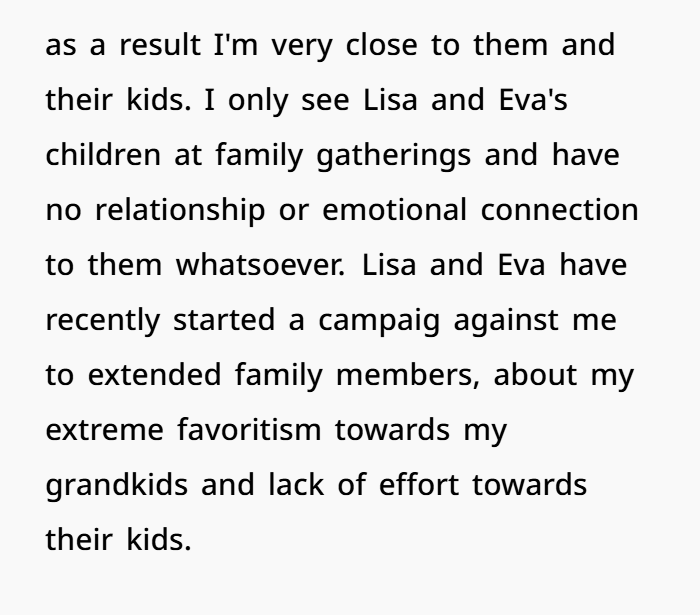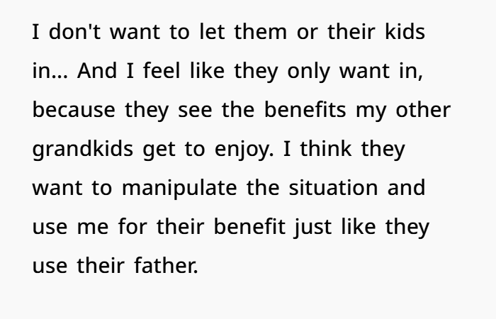 One of the biggest red flags here is timing. Lisa and Eva didn’t come around when the OP was trying. They came around when they saw her with other grandchildren—and saw the warmth, support, and joy she shared with them. Now suddenly it’s unfair?