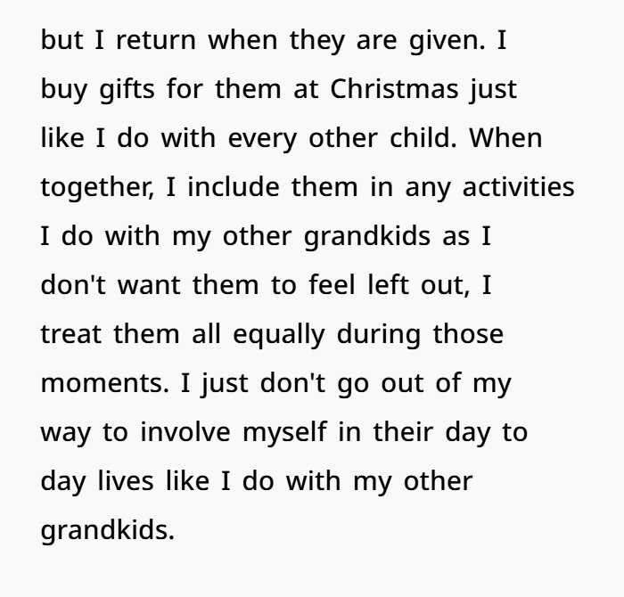 Also, let’s not forget: the OP hasn’t been given access to build those bonds. She’s polite, kind, inclusive when they’re around. That’s more than a lot of grandparents are. She’s not punishing the kids—she’s just not forcing what isn’t there.