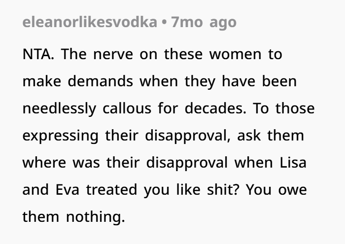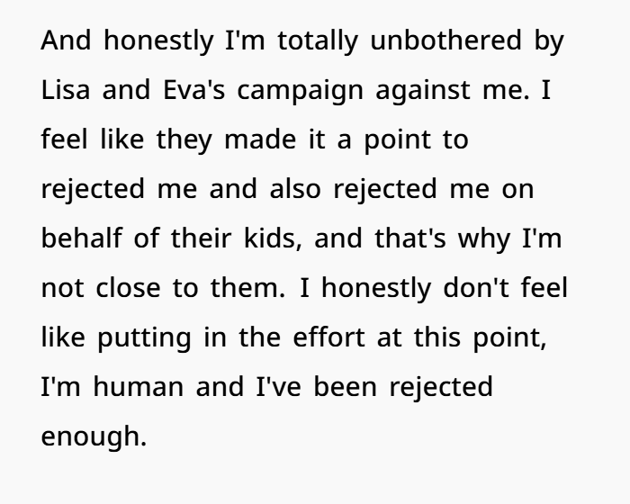 It would be different if Lisa and Eva came to her with accountability—saying, “We’re sorry for how we treated you. Can we build a better relationship now?” But that’s not what’s happening.