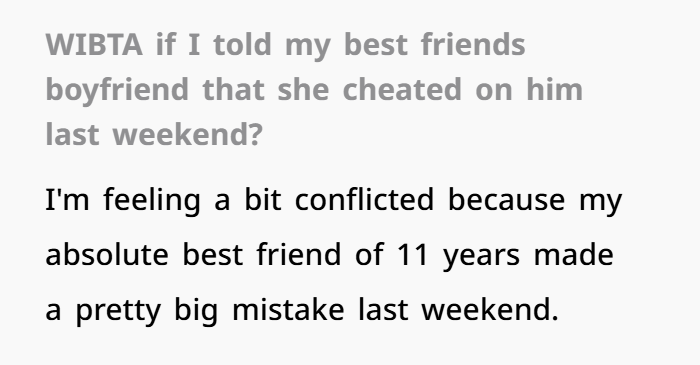 A woman asked the internet for impartial advice on whether she should tell her BFF’s boyfriend that she recently had an affair