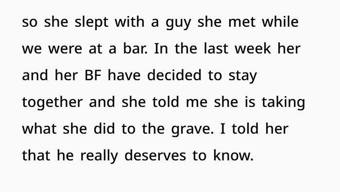 You’ve been best friends for 11 years. She’s in a long-term relationship (8 years) and they have kids together. Lately things have been rocky. During a night out, she told you she planned to break up, then ended up sleeping with someone she met at a bar. In the days since, she’s decided she wants to stay in the relationship, but insists she’ll keep what happened a secret — “taking it to the grave.”