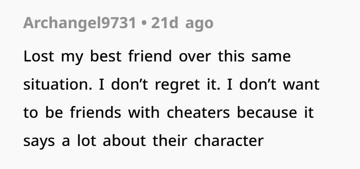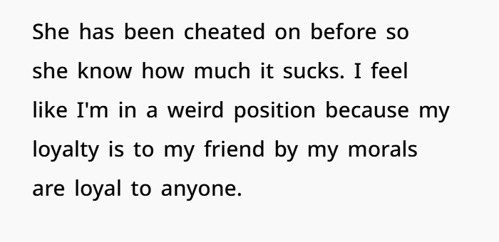 On the other hand, you see a different covenant: toward truth and fairness. If you believe in honesty, you feel complicit in betrayal by staying silent. Especially given the history: she’s been cheated on in the past. You empathize with how devastating that is.