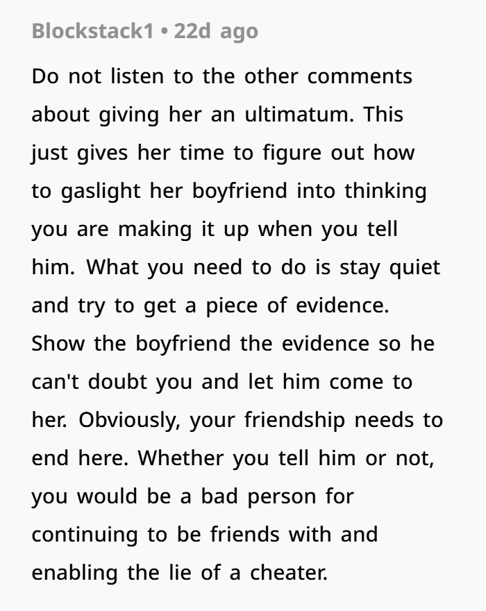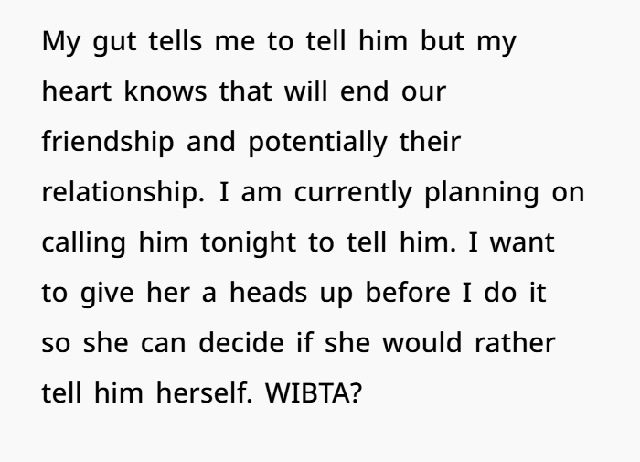 You believe her boyfriend deserves to know. You hate the idea of him being betrayed, especially since she’s been cheated on before. Your gut tells you he should hear it; your heart worries about the cost — to your friendship, to their relationship, to the children. Now you’re planning to call him tonight and you want to give your friend a heads up. WIBTA?