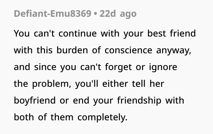 Most internet users thought the woman should definitely tell her friend’s boyfriend about what she did