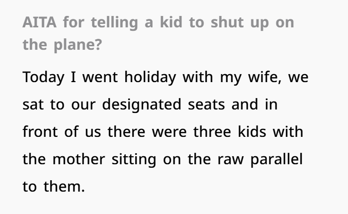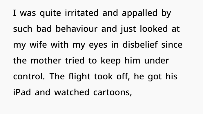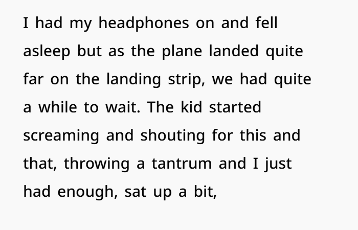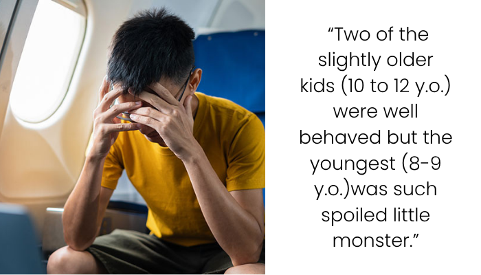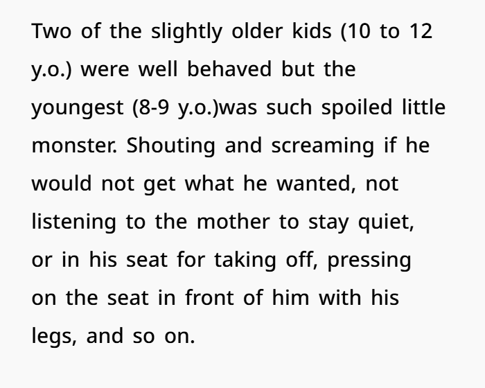 Here’s a classic case of in-flight frustration taken to its limit. OP and his wife were seated behind a trio of kids, accompanied by their mom sitting parallel to them on a recent flight. While two of the children were chill, the youngest (estimated between 8-9 years old, later possibly re-evaluated as 4) was having what can only be described as a non-stop tantrum fest — screaming, kicking the seats, ignoring his mother, and doing everything short of summoning gremlins on the wing.