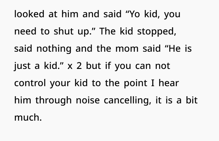 The kid immediately quieted down. The mom hit him with the classic “He’s just a kid” — twice. Meanwhile, even the child’s own sibling offered a kind of comic commentary: