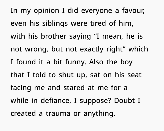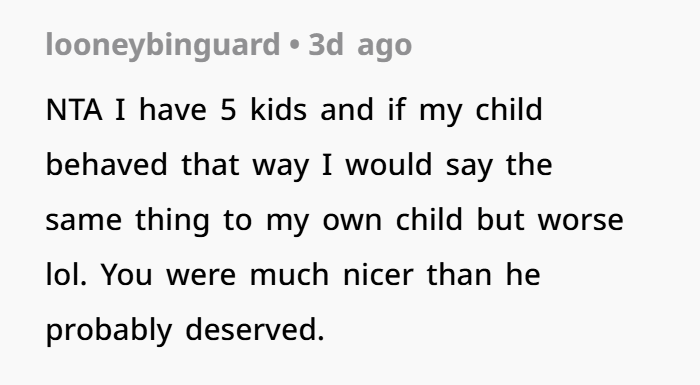That’s kind of the whole situation in a nutshell. You might not have been polite, but you weren’t wrong. Even the kid’s own family was fed up — and that says a lot.