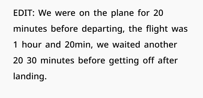 OP tried to keep his cool — headphones on, silent glances at his wife — but once they landed and the chaos continued, he snapped and said what many passengers have only fantasized about: