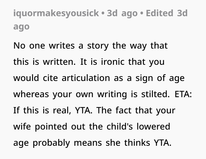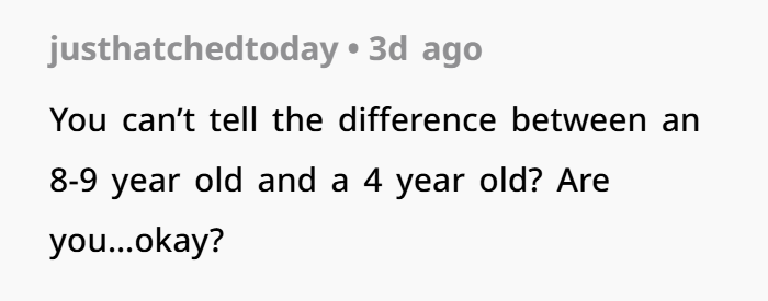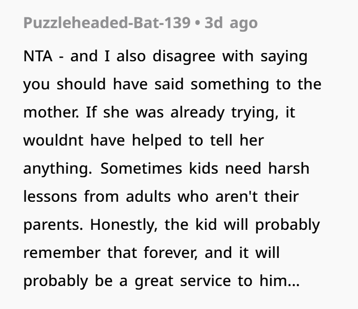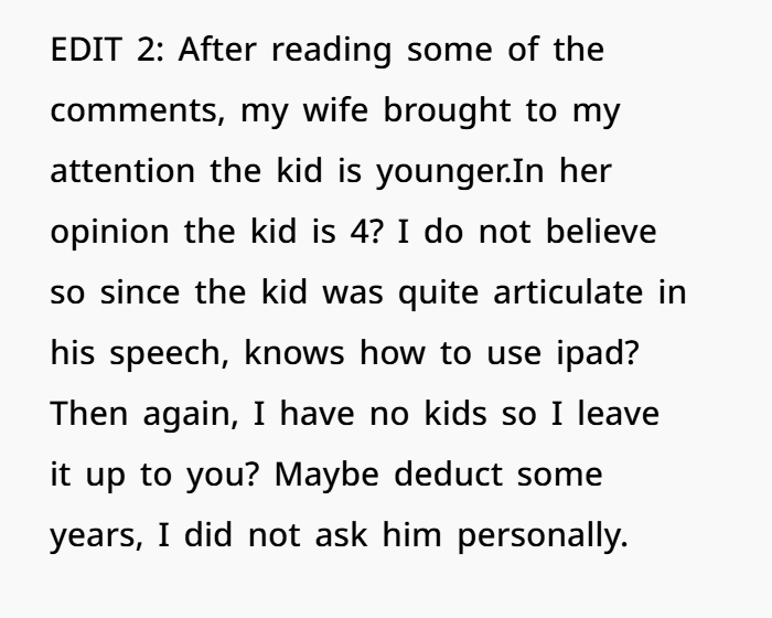 OP originally thought the child was around 8–9. His wife later said the boy looked closer to 4. That matters — a little. A younger child does earn more leeway, especially if they’re neurodivergent or overwhelmed.