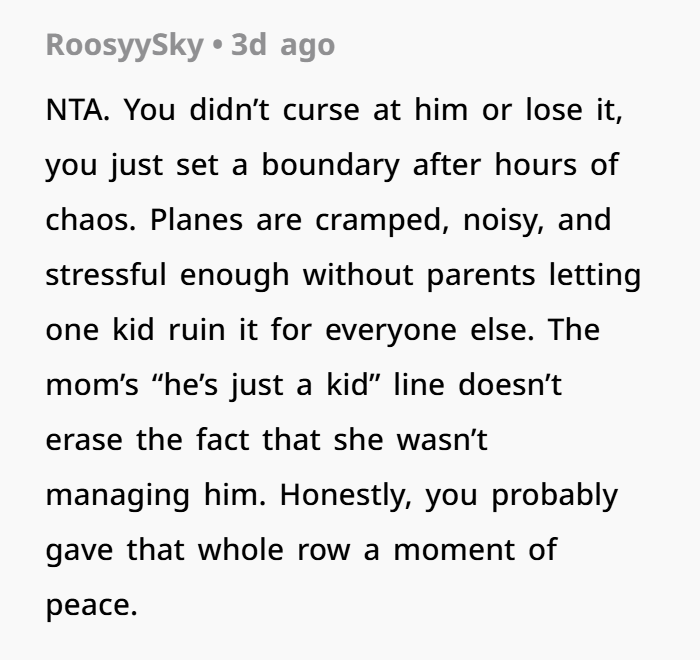 Parenting is hard. Flying with kids is harder. But that doesn’t mean the rest of the plane needs to suffer for hours because one child can’t be managed. OP may not have used the softest words, but when pushed to the limit, he did what a lot of passengers only dream of doing.