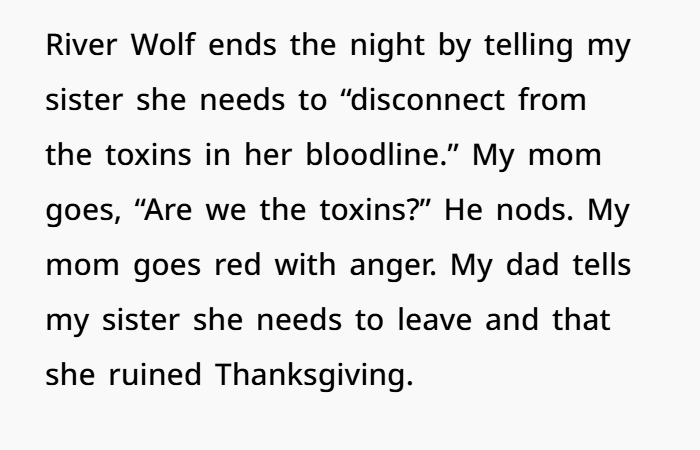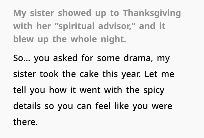 One person opened up online about how their sister sparked lots of drama at their family Thanksgiving dinner by inviting her ‘spiritual guide,’ who had the aura of a con man