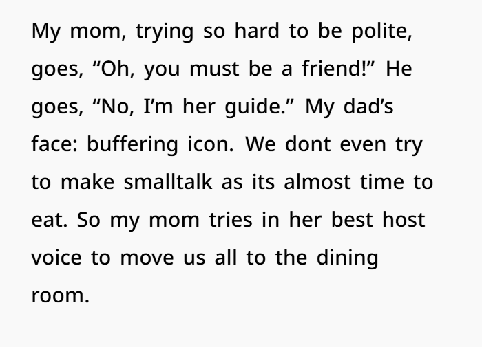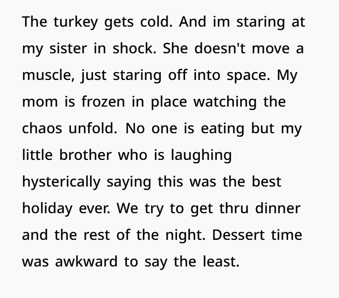 At the end of this chaotic meal and ruined holiday, what stands out is this: your sister chose a guide over family cohesion. She chose spectacle over respect. And when that happens — you get hurt, you get angry, you get betrayed.