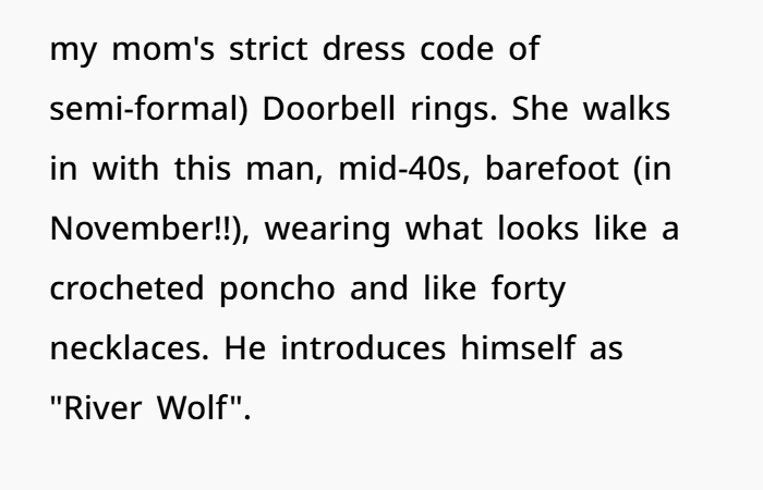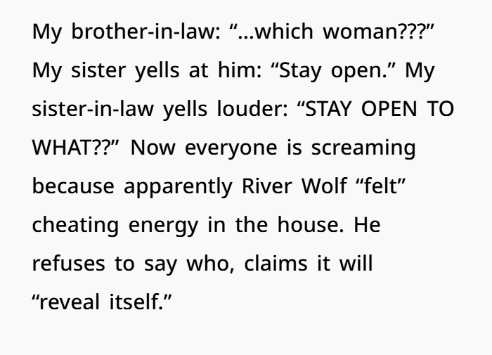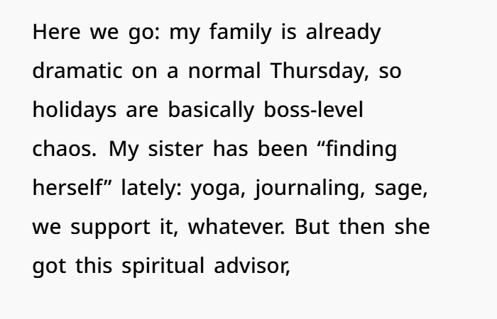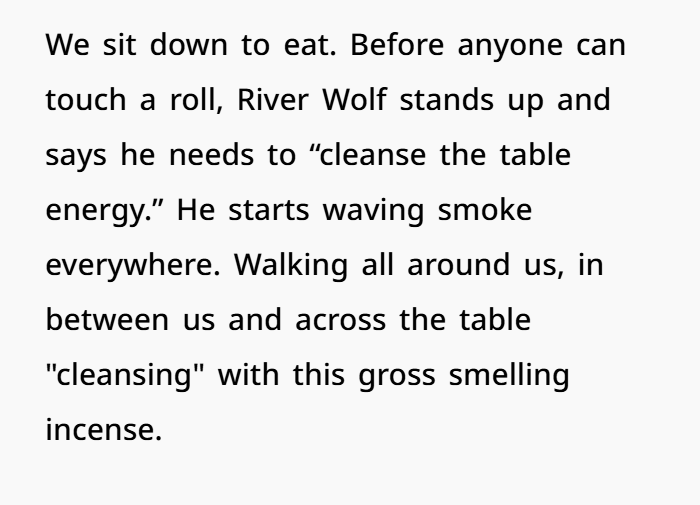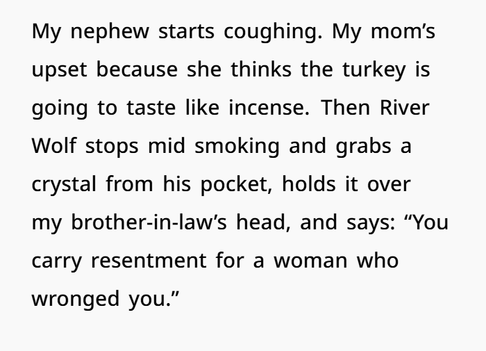 So — this Thanksgiving, everything went sideways. My sister showed up late — with her “spiritual advisor,” a barefoot, necklace‑heavy guy calling himself “River Wolf.” At first, we tried to play nice. But as soon as we sat down, he loudly declared he needed to “cleanse the table energy,” waved incense through the air (my nephew choking, turkey getting cold), then started diagnosing my brother-in-law with “resentment energy” for “a woman who wronged him.” No names. Just vague aura talk.