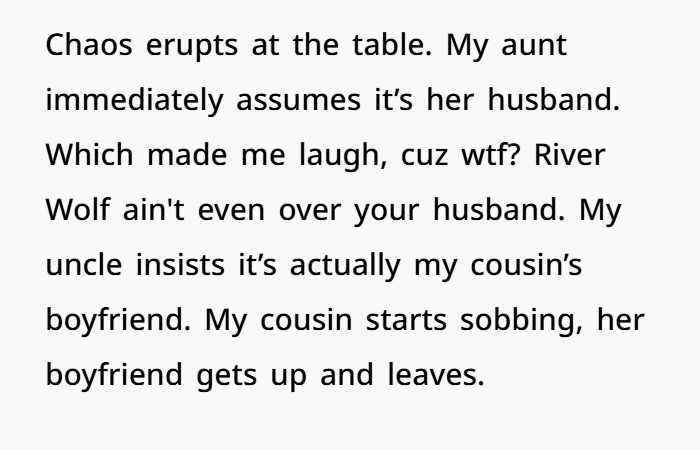 In sociology and psychology, there are countless stories of “family rituals gone wrong.” Whether it’s religious ceremonies, family traditions — sometimes people use those moments to exert power, reveal secrets, stir drama. And when someone new — like River Wolf — enters that dynamic with authority (or claims thereof), it shakes the foundation.