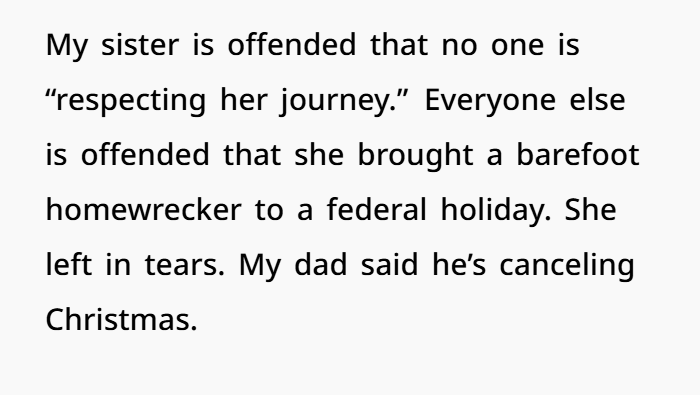 That one moment cracked open all the tension. Chaos erupted. Accusations flew. Family fights, crying cousins, thrown rolls, spilled drinks, upset parents. The whole meal evaporated. My dad ended up saying he’s cancelling Christmas — and my sister left in tears, insisting we “need to respect her spiritual journey.” But the rest of us? We’re ticking. She’s now demanding we gather at her house for a “family healing circle.” Meanwhile, my parents are quietly planning a secret “intervention.” Genuinely can’t wait to see how that goes.