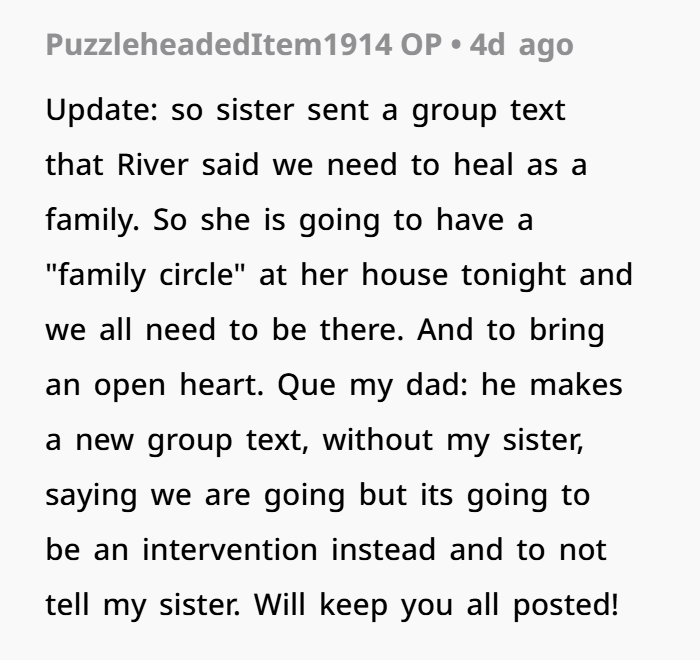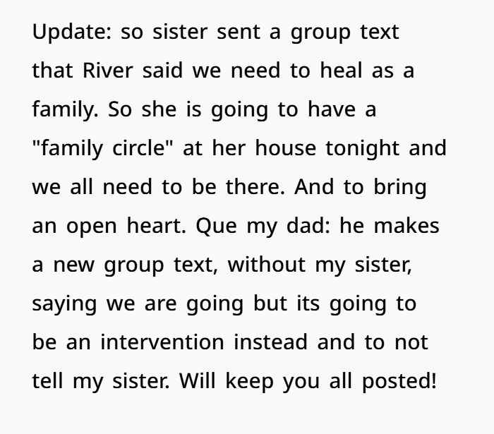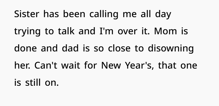 Also — forcing a “family circle” tonight is basically asking everyone to relive trauma. To relive embarrassment, suspicion, shame. To sit again with someone who just humiliated a bunch of people. That’s insane. You don’t owe your sister peace or forgiveness. You owe yourself clarity and protection.