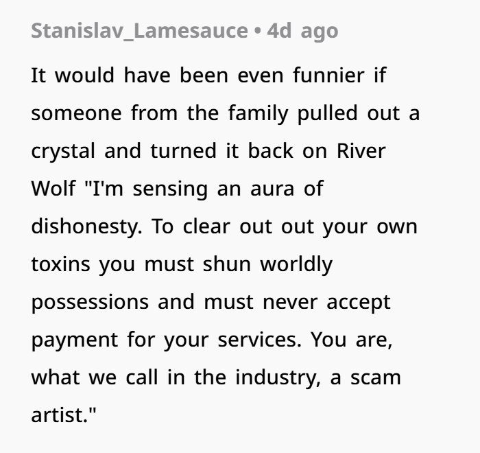 That “guide” you described — incense, crystals, mystical energy, accusations — that’s textbook red‑flag territory. It doesn’t matter whether you believe his stuff or not. When you drag that vibe into a family gathering — a place meant for comfort, connection, food — and start accusing people of “toxic energy” or “ancestral resentment”? It stops being spiritual healing, it becomes a theatrical power play.