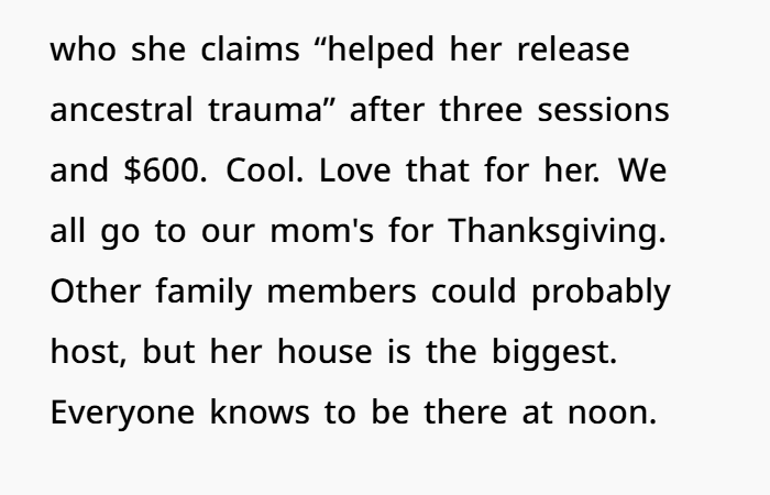 That’s not a “healing circle.” That’s emotional warfare disguised as spiritual intervention. It’s no wonder the fallout is massive. Because once trust breaks, it’s harder to rebuild. Especially when your mom heard, “You are toxins,” while holding on to decades of memories, feelings, traditions.